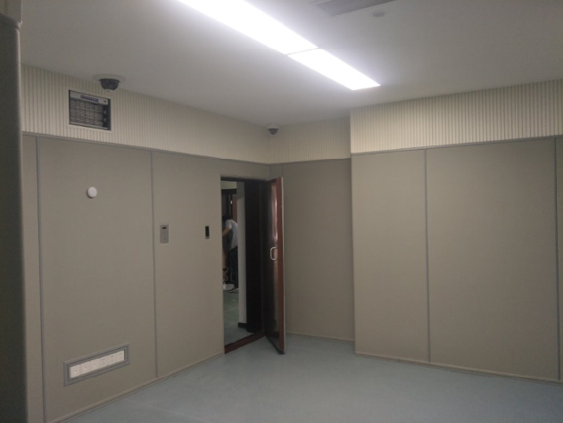 紀委審訊室安裝方法:劃線定位→基層板清潔處理→地腳線安裝→防撞墻板底座安裝→刷膠粘防撞墻板→壓邊條安裝→吸音板安裝。