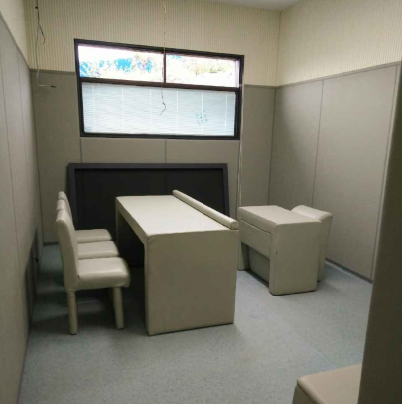 審訊室布局考慮到訊問的嚴(yán)肅性和成像效果,訊問室內(nèi)的布置和顏色,以及審訊桌椅的色調(diào)必須烘托主題,營造審訊的氛圍。派出所、檢察院等辦案區(qū)訊問室的墻面有嚴(yán)格要求,墻面材料需要兼具環(huán)保、防撞、阻燃特性,與傳統(tǒng)的聲學(xué)材料相比,新型材料更加具備以上的能力,能大大提高審訊安全性。從訊問室的威嚴(yán)性和攝像機拍取視頻圖像的角度說,訊問室整體裝修色調(diào)不要太花哨,不易進行過多的擺設(shè)。
