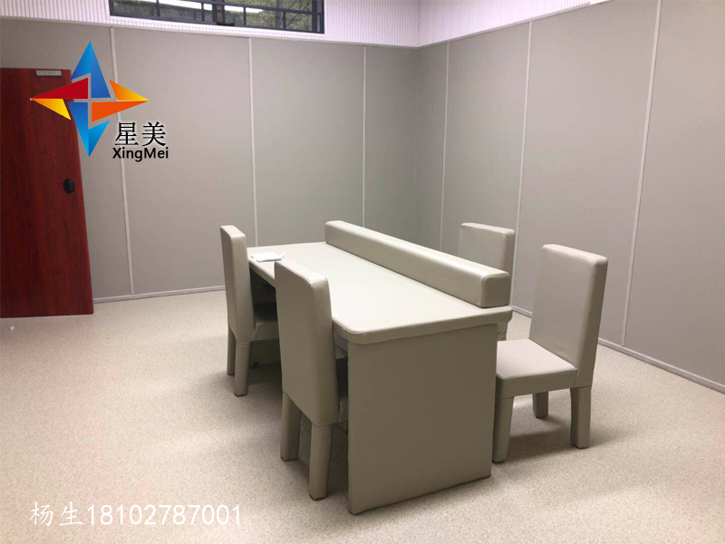 1、墻面安裝新型防撞軟包以防在審訊的過程中嫌疑人通過撞墻或者利用室內硬物致殘的行為影響辦案進度,再者也是為了防止出現人員沖突的特殊情況,為執法人員及嫌疑人的人身安全提供了一個基礎的保障。