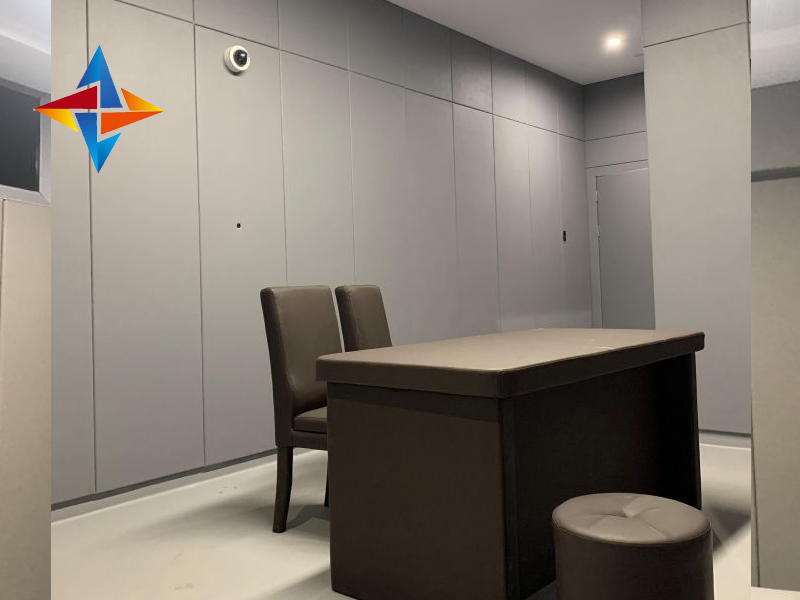 審訊室布局考慮到訊問的嚴肅性和成像效果,訊問室內的布置和顏色,以及審訊桌椅的色調必須烘托主題,營造審訊的氛圍。派出所、檢察院等辦案區訊問室的墻面有嚴格要求,墻面材料需要兼具環保、防撞、阻燃特性,與傳統的聲學材料相比,新型材料更加具備以上的能力,能大大提高審訊安全性。從訊問室的威嚴性和攝像機拍取視頻圖像的角度說,訊問室整體裝修色調不要太花哨,不易進行過多的擺設。