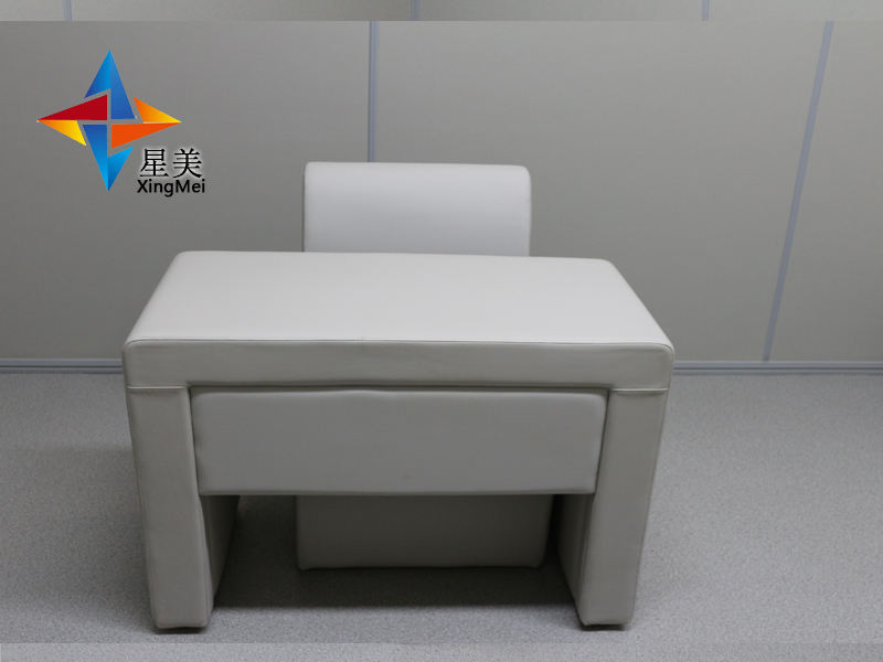 談話室軟包-防火防撞桌椅簽字桌子:尺寸為1000*450*680mm,顏色為黑色,黃色,灰色,由多層實木板+20mm厚的橡膠棉+1mm厚的小荔枝紋阻燃皮革組成,整體功能:防火防撞防火。