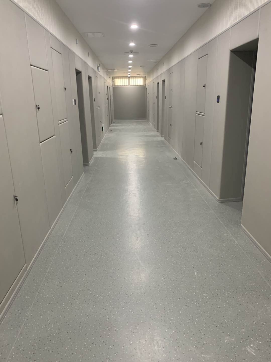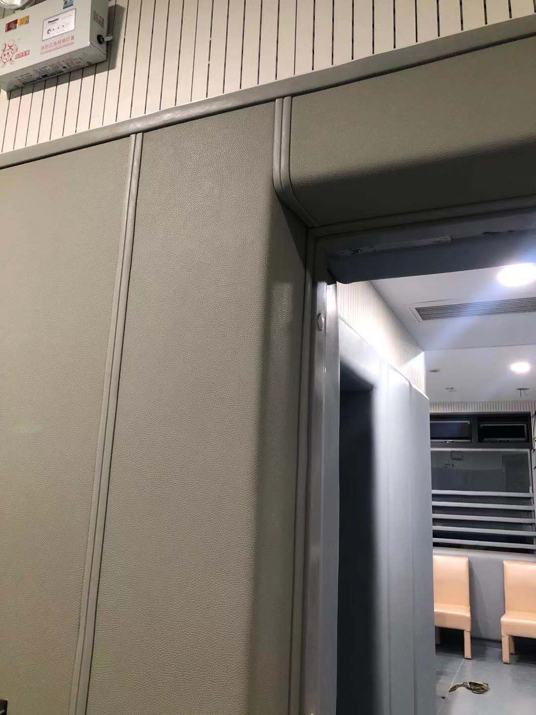飾面采用原材料防火阻燃的皮革,兩者進行高溫火附的無膠復合方法制造而成。經過層層賽選,其飾面皮革顏色符合制造的色號只有淺灰色和米黃色,因為其他顏色的吸熱性能跟褶皺性能而不符合制造留置室軟包,所以選取了米黃色或者淺灰色為飾面顏色。制造規格為寬度1250mm,高度2450mm。總體厚度具有20mm和30mm。采用軟
